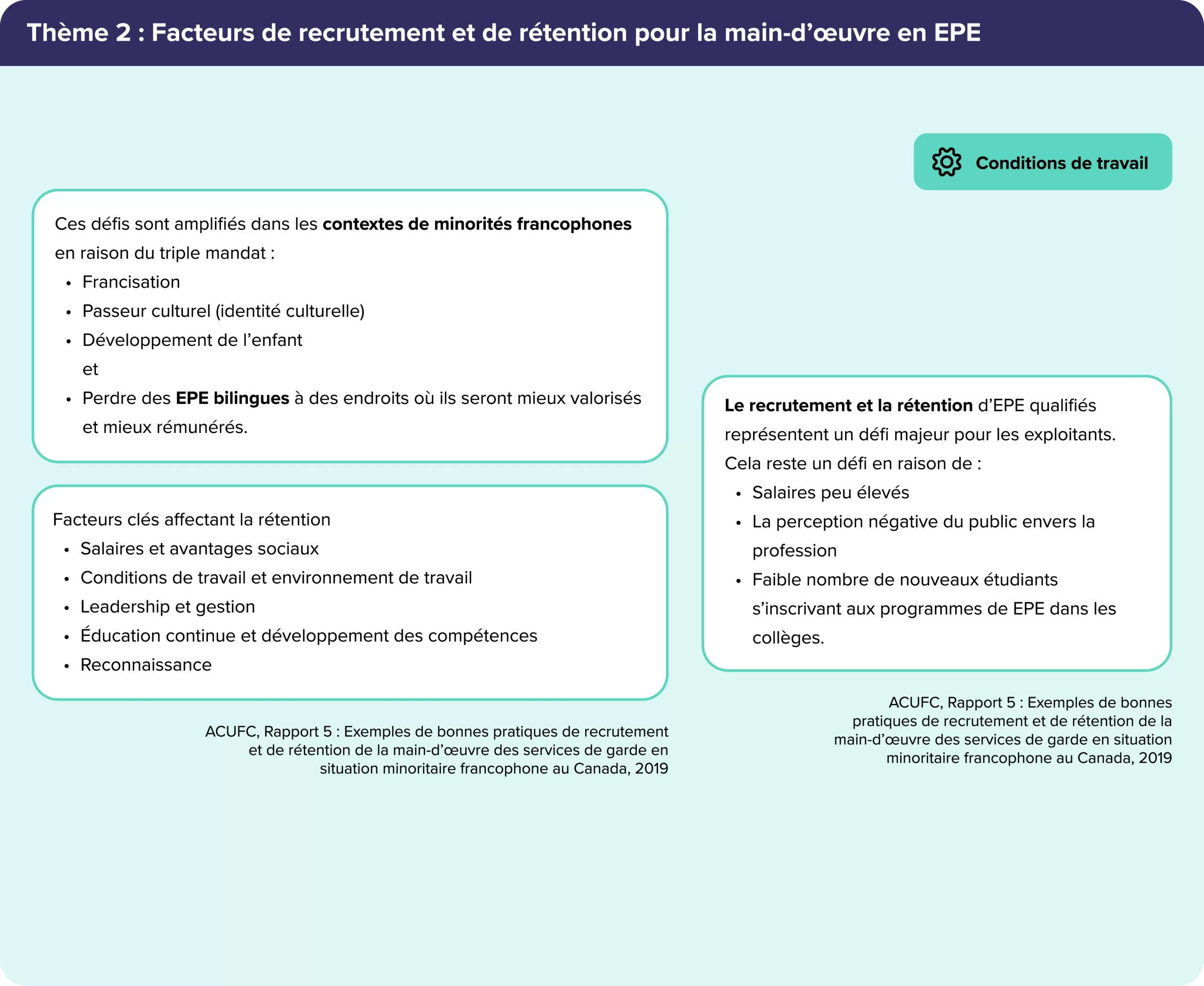 - Le personnel cite la retraite, des raisons liées à la santé, les responsabilités familiales et le travail en dehors du secteur de l'EAJE comme les raisons les plus susceptibles de les pousser à quitter leur emploi, ce qui suggère qu'ils envisagent souvent des perspectives de carrière limitées dans ce secteur.