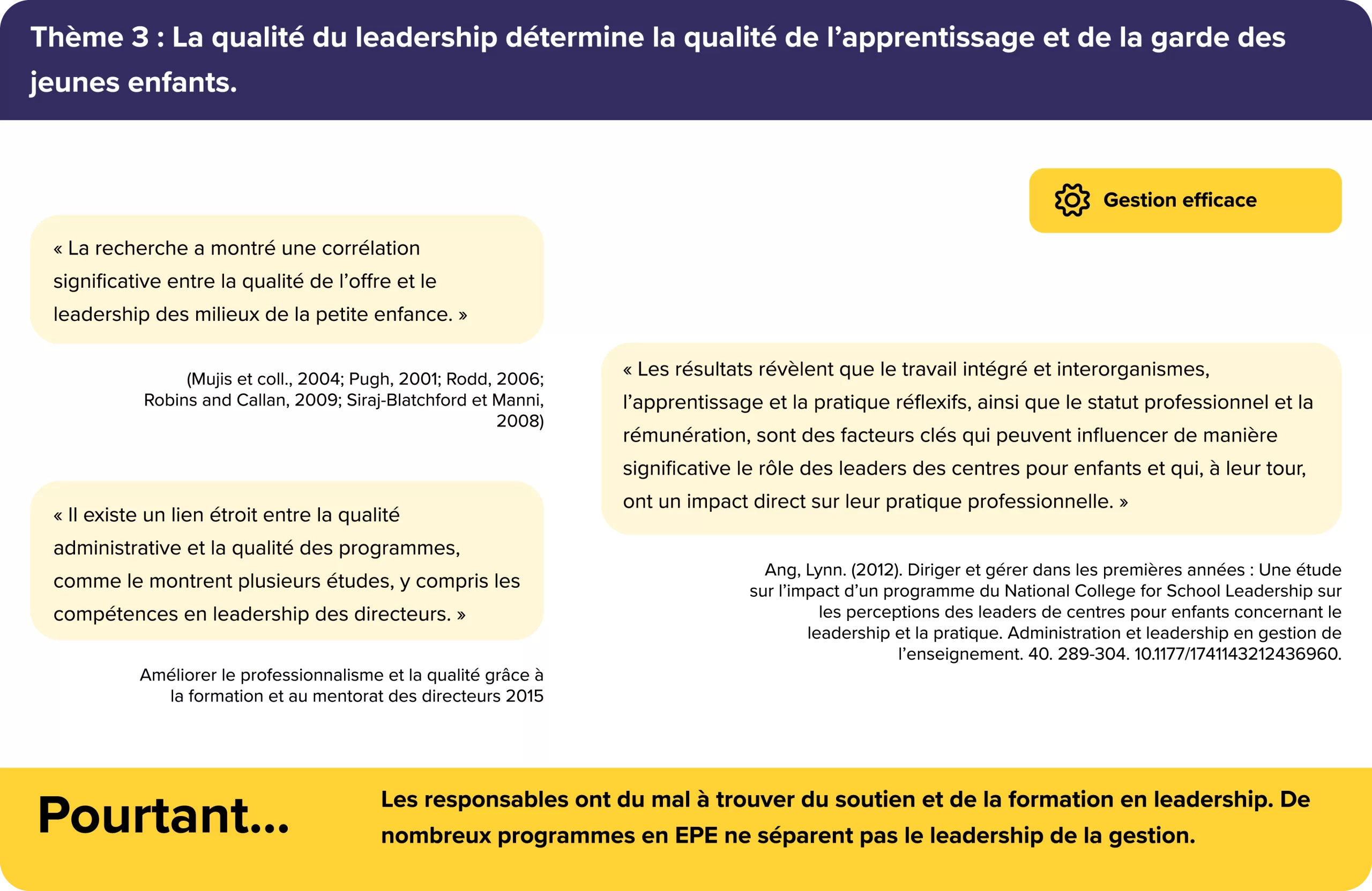 - Les membres du personnel qui perçoivent le leadership comme étant davantage réparti dans leur centre d'EAJE ont tendance à s'engager plus fréquemment dans des pratiques de collaboration professionnelle et se déclarent plus satisfaits de leur travail.