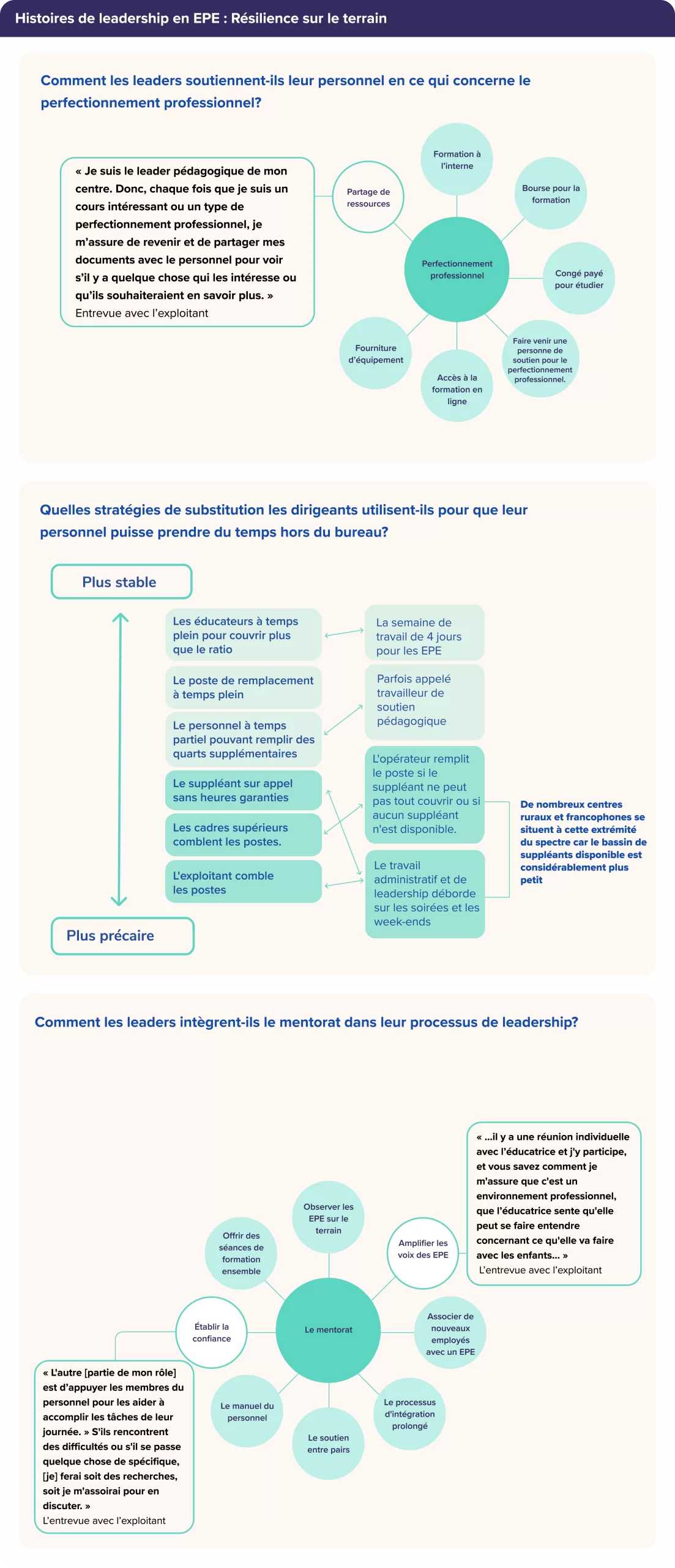 En 2022, dans le cadre de la deuxième ronde du Laboratoire d’EPE, nous avons mené des entrevues avec 18 exploitants, directeurs et administrateurs de centres d’apprentissage préscolaire. Les perspectives offertes par ces leaders ont été combinées avec des idées tirées de la recherche menée lors de la première ronde du laboratoire. Ensemble, les données ont brossé un portrait détaillé des leaders en EPE : ce qui les motive, les parcours qu’ils empruntent vers le leadership et comment ils exercent leur leadership dans leurs rôles – en tant que gestionnaires, propriétaires, responsables pédagogiques, leaders pairs ou mentors.